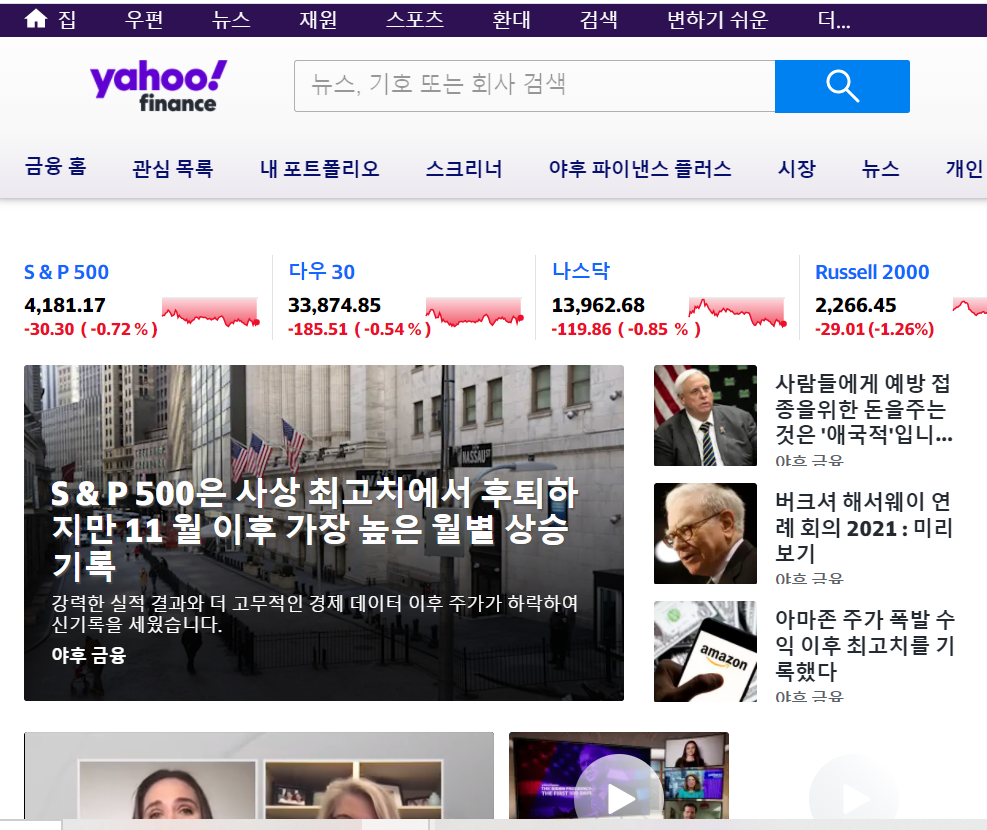 기존 미국주식 하시는 분들은 다들 알고 계시죠? 야후 파이낸스입니다. 한글사이트는 아니지만, 크롬 브라우저에서 번역기 설치하시면 한글로 번역된 정보를 볼 수 있어요.