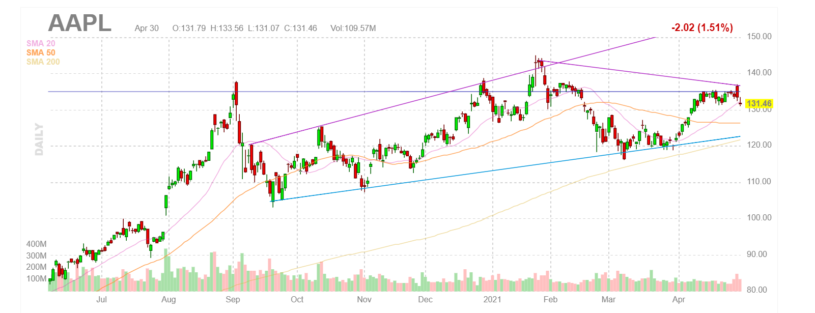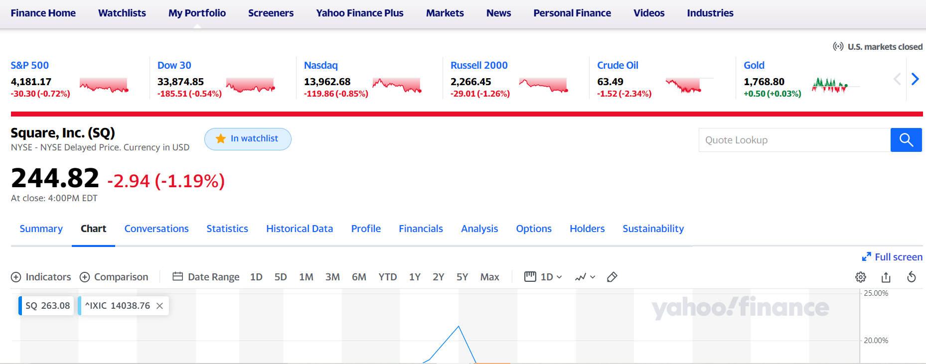 물론 이런 정보만 제공하는 것은 아니고, 개별 주식에 대한 정보 역시 제공합니다. 관심 주식이 있는 경우 일단 찾아보게 되는 사이트인데요. 종목 티커를 검색 시 이렇게 차트 외에도 해당 주식에 대한 정보를 제공해 주고 있습니다.